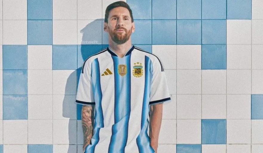 El conjunto se completa con pantalones y medias en tonos azul marino, celeste y dorado, generando una imagen que combina historia, identidad y el recuerdo de la gloria reciente obtenida en Qatar.
