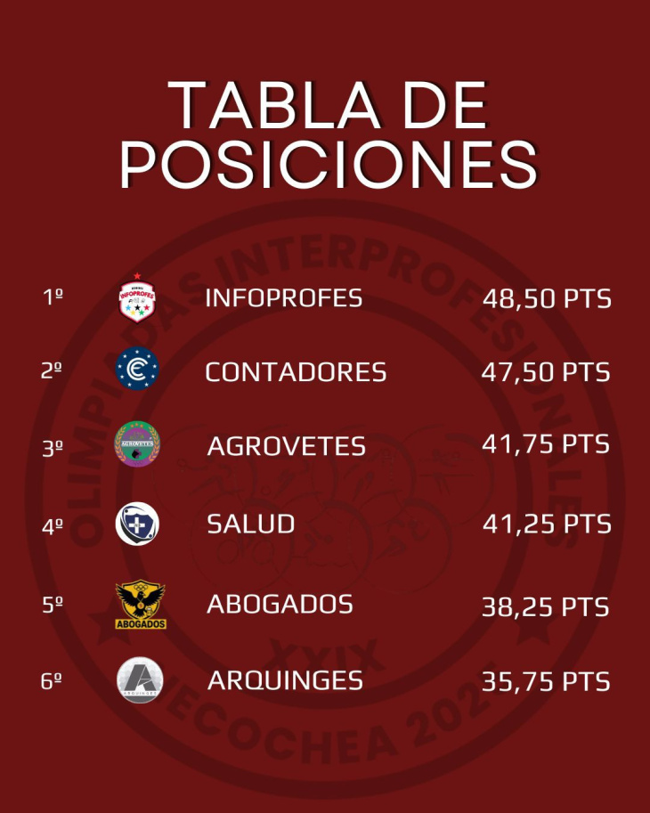 Tras el juego de la generala, los Infoprofes -últimos campeones- siguen en lo más alto de las posiciones, ahora con apenas un punto de ventaja respecto de los Contadores.