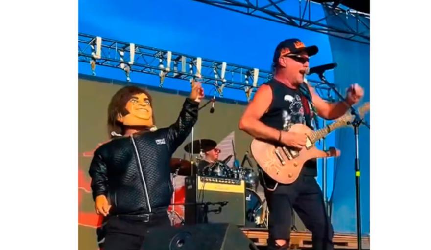 La escena se dio durante el “Festival tdF5Kg Dama’s Day” en Luján, un evento que reúne a los amantes de las Harley Davidson. Mientras la banda interpretaba su popular tema, un hombre de baja talla disfrazado de Javier Milei (con una máscara que imitaba el rostro del Presidente) apareció sobre el escenario.