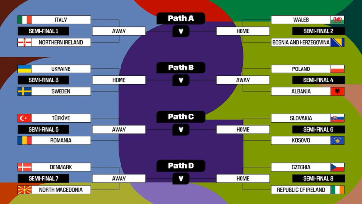 En primer orden, los 12 segundos de los grupos de la Eliminatoria de UEFA (Eslovaquia, Kosovo, Dinamarca, Ucrania, Turquía, Irlanda, Polonia, Bosnia y Herzegovina, Italia, Gales, Albania, República Checa, Macedonia del Norte, Rumania, Suecia e Irlanda del Norte) más los cuatro mejor ubicados en la Nations League 2024/2025 que no terminaron entre los dos primeros de las zonas (Rumania, Suecia, Irlanda del Norte y Macedonia del Norte) formarán las ocho llaves de semifinales que desembocarán en cuatro finales, todas series a partido único del 26 al 31 de marzo, que determinarán a los cuatro clasificados.