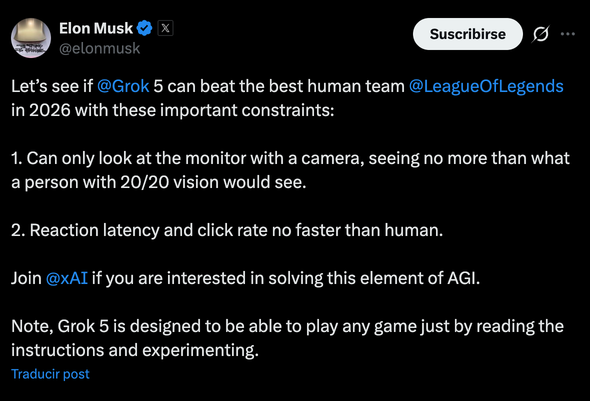 Musk aseguró que Grok 5 está diseñada para aprender cualquier juego “leyendo instrucciones y experimentando”. En un título como League of Legends —de acceso intuitivo pero de profundidad enorme— este cruce entre tecnología y deporte electrónico promete ser uno de los eventos más comentados de 2026.