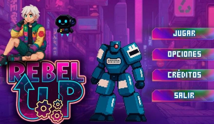 Rebel UP es un juego de plataformas en pixel art donde el jugador controla a Rebel, un personaje de género personalizable, acompañado por W4CH1, un pequeño robot guía que aporta narrativa, humor y tutoriales dentro del juego.