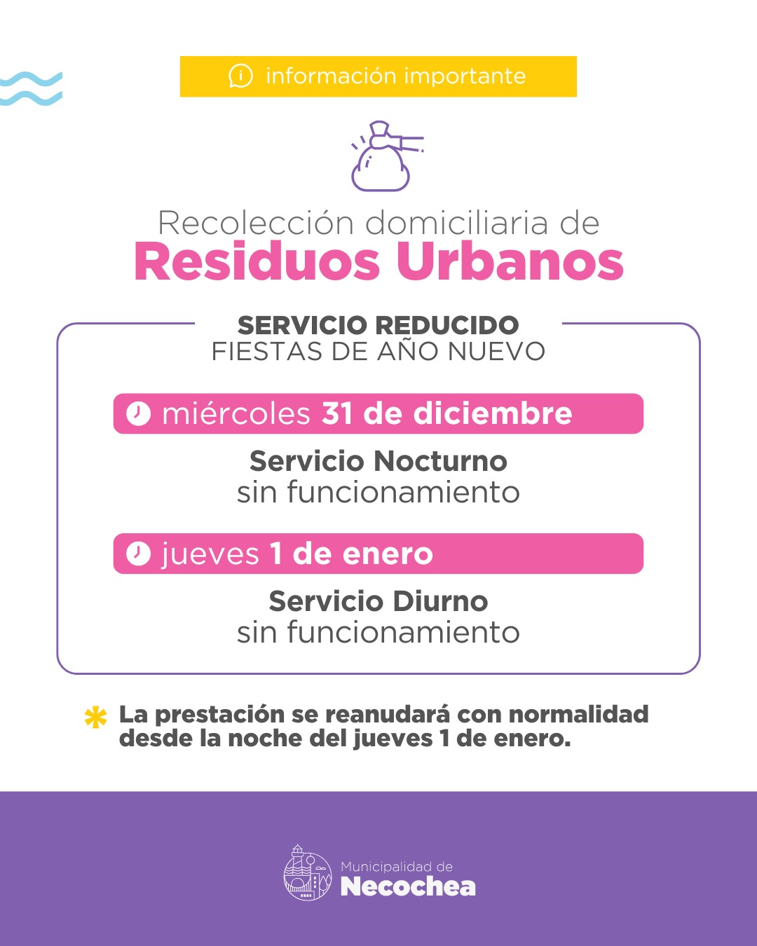 En este sentido, este miércoles 31 de diciembre no funcionará el servicio nocturno, mientras que mañana jueves 1 de enero no habrá recolección en el turno diurno . Finalizados estos ajustes excepcionales, el servicio se retomará con normalidad el mismo jueves por la noche.