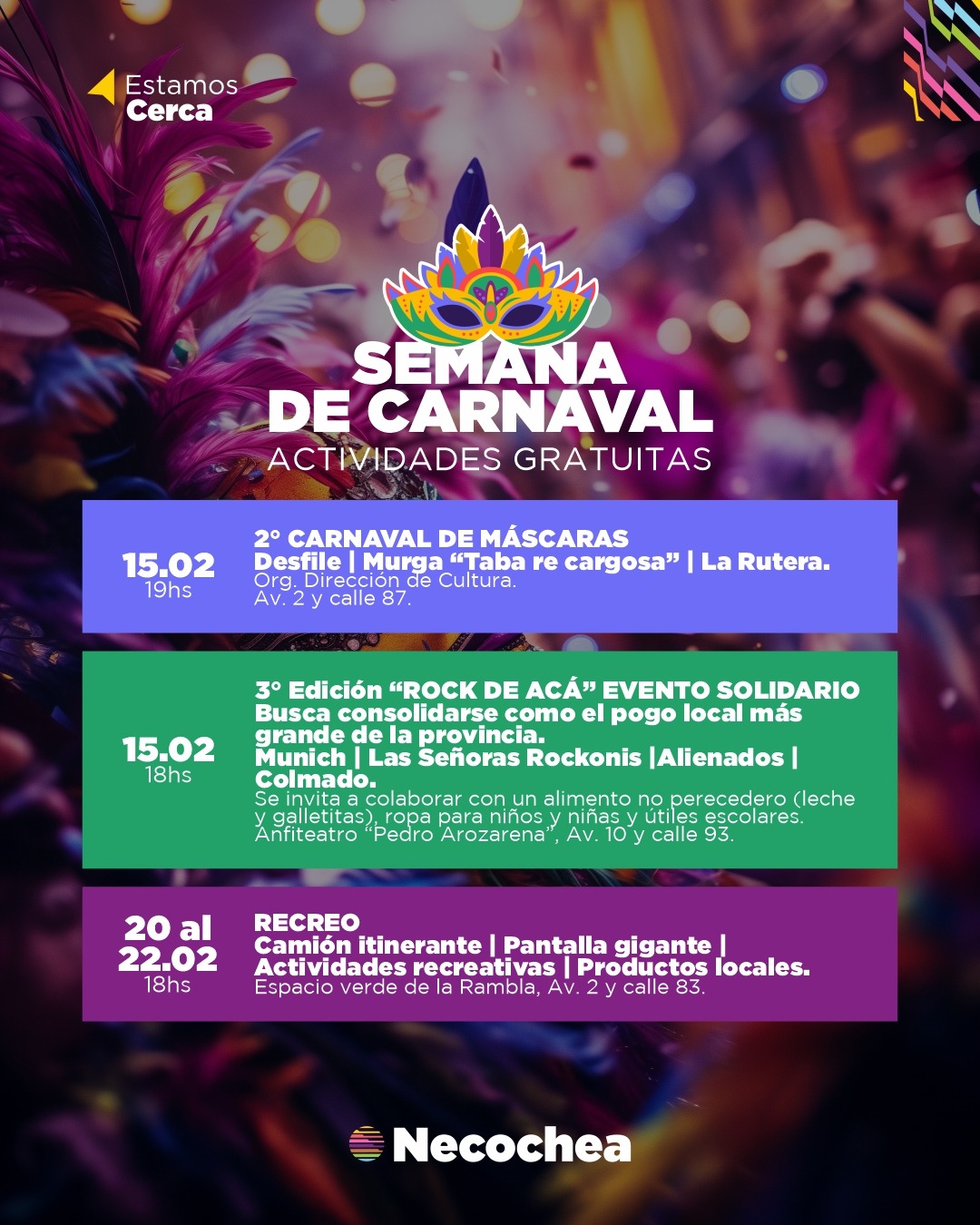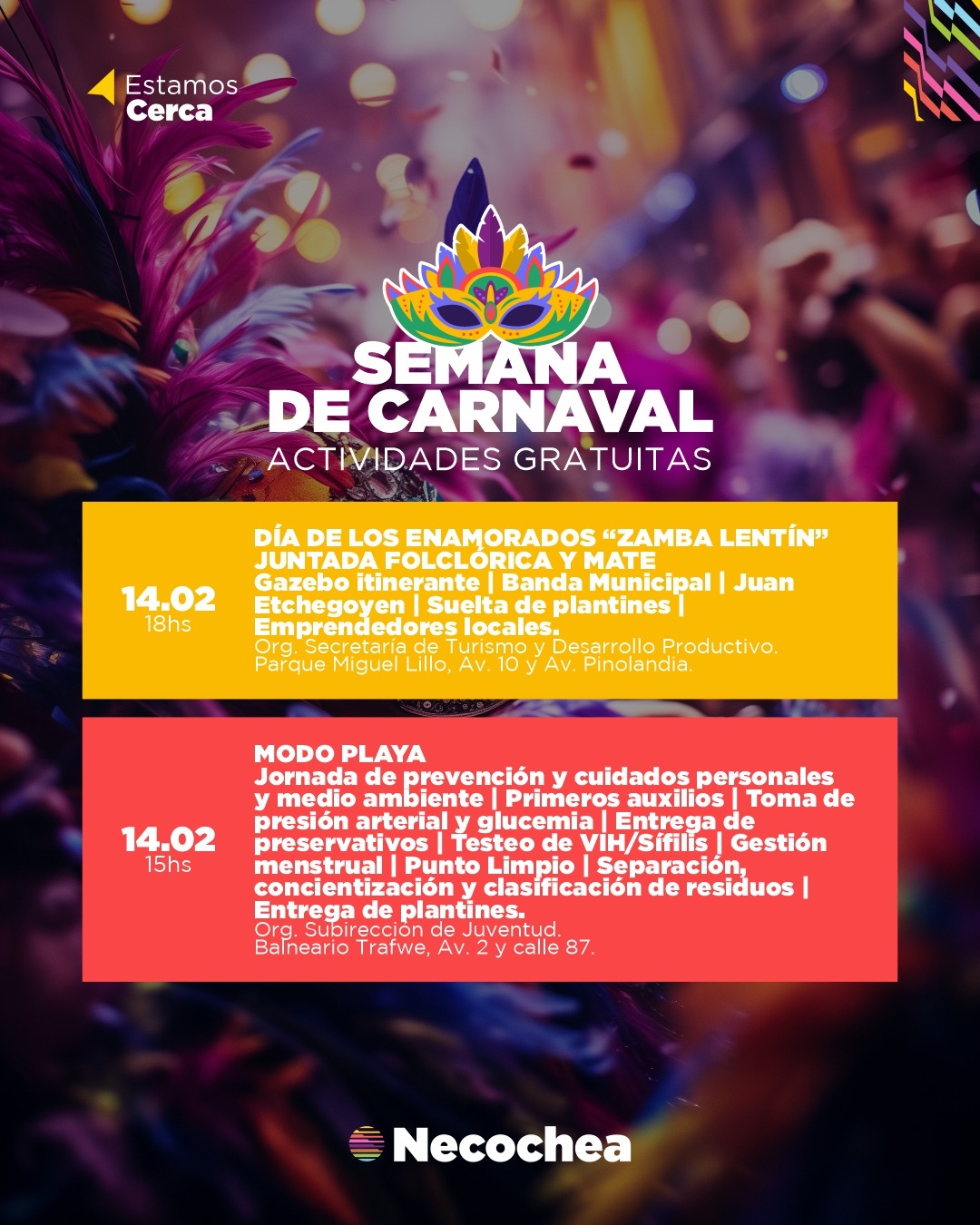 La Secretaría de Turismo y Desarrollo Productivo, a cargo de Matías Sierra, informa la agenda de actividades programadas para la Semana de Carnaval, que comienza el sábado 14 de febrero, con el feriado extralargo del lunes 16 y martes 17.
