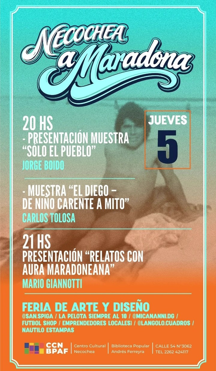 A las 21 tendrá lugar “Relatos con aura maradoniana”, a cargo de Mario Giannotti, con el acompañamiento del Círculo de Periodistas Deportivos de Necochea, en una propuesta que combinará memoria, anécdotas y reflexión en torno a la figura del ídolo popular.