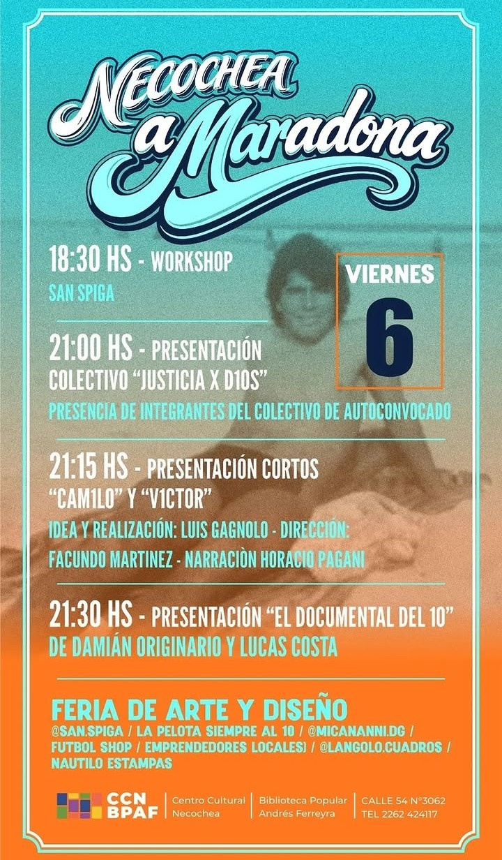 El sábado 7 la actividad comenzará por la mañana, a las 9.30, con la realización del mural del Diego en Necochea, a cargo de San Spiga, en una propuesta que se desarrollará fuera del Centro Cultural y que buscará dejar una nueva huella artística en la ciudad.