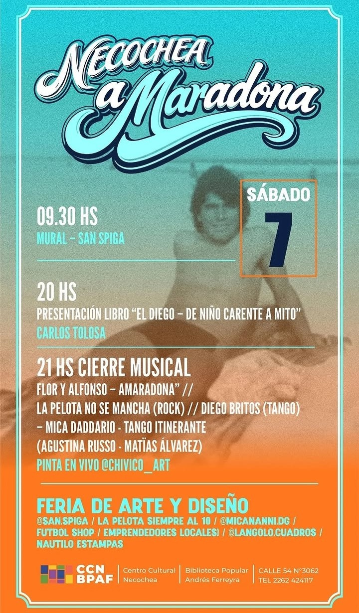 Por la noche, desde las 20, Carlos Tolosa presentará su libro “El Diego, de niño carente a mito”. El cierre musical, previsto para las 21, contará con la participación de Flor y Alfonso; la banda “La Pelota no se mancha” (rock); Diego Britos (tango); Mica Daddario (tango itinerante); Agustina Russo y Matías Álvarez. Además, el artista Chivico Art pintará en vivo durante la jornada.