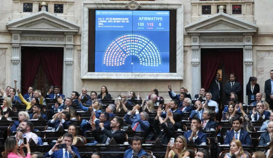 El oficialismo aprobó la Modernización Laboral con el acompañamiento del PRO, la UCR, el MID, y fuerzas peronistas que responden al gobernador de Tucumán, Osvaldo Jaldo. También el apoyo de los sanjuaninos de Marcelo Orrego, de Misiones del mandatario Hugo Passalacqua junto al referente político local, Carlos Rovira, y los salteños de Gustavo Sáenz. El rechazo se concentró en las bancadas de UxP, el Frente de Izquierda y parte de Provincias Unidas.